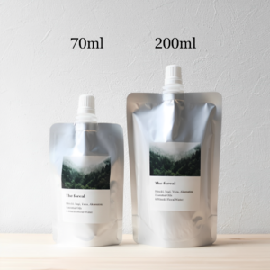 森の香。foreal の天然精油と芳香蒸留水を配合したアロマミスト。ルームスプレーとして寝具やお手洗いはもちろん、入浴中に噴霧して癒しのミストをお楽しみいただけます。20倍に希釈してサウナのロウリュウォーターとして使用することもできます。